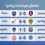 ភ្នំពេញ៖ យោងតាមការជូនដំណឹងគណៈកម្មការប្រកួតបាល់ទាត់ជាតិកម្ពុជា (CNCC) បានឱ្យដឹងថា សម្រាប់លទ្ធផលការប្រកួតបាល់ទាត់ លីគកំពូលកម្ពុជា រដូវកាល២០២១ ដែលមានចំនួន៤គូនៅថ្ងៃអាទិត្យ ទី១៨ ខែកក្កដា ឃើញថា ព្រៃវែងអេហ្វស៊ី ចាញ់ព្រះខ័នរាជស្វាយរៀង ១ទល់នឹង២, វិសាខាឈ្នះសូលទីឡូអង្គរ ៥ទល់នឹង០, បឹងកេត ឈ្នះសមាគមកីឡាបាល់ទាត់កងយោធពលខេមរភូមិន្ទ២ទល់នឹង០ និងភ្នំពេញក្រោនឈ្នះអគ្គិសនីកម្ពុជា ៦ទល់នឹង០។ ក្រោយការប្រកួតនេះ យើងឃើញថា មានរឿងរ៉ាវគួរចាប់អារម្មណ៍មួយចំនួនដូចខាងក្រោម ៖