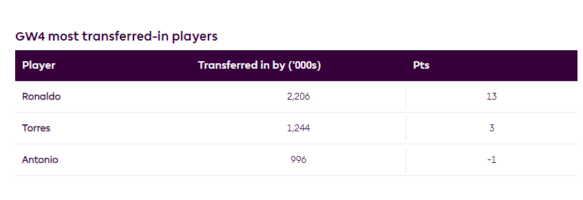 Cristiano Ronaldo (តម្លៃ ១២.៥ លានផោន) បានផ្តល់រង្វាន់ភ្លាមៗសម្រាប់កំណត់ត្រាអ្នកគ្រប់គ្រង Fantasy Premier League រហូត ២,២ លាននាក់ ដែលបានផ្ទេររូបគេចូលមកក្នុងក្រុម ខណៈ Ronaldo រកបាន ២ គ្រាប់ ក្នុងជ័យជម្នះក្នុងលទ្ធផលបច្ចេកទេស ៤-១ លើក្រុម Newcastle United។