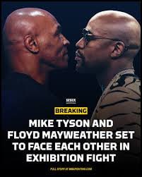 ស្តេចប្រដាល់ Floyd Mayweather Jr. និង Mike Tyson នឹងឡើងរិញជាមួយគ្នាសម្រាប់ព្រឹត្តិការណ៍ដ៏ពិសេសនៅនិទាឃរដូវបន្ទាប់នេះ ។ សេចក្តីប្រកាសនេះត្រូវបានធ្វើឡើងកាលពីថ្ងៃព្រហស្បត៌ម្សិលមិញ ដោយបន្ថែមថា ជំនួបនេះនឹងរៀបចំឡើងដោយស្ថាប័ន CSI Sports / Fight Sports គ្រាន់តែកាលបរិច្ឆេត និង ទីតាំង នៅមិនទាន់ច្បាស់នៅឡើយ ។