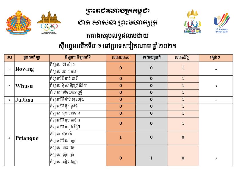 យោងតាមគណៈកម្មាធិការជាតិរៀបចំការប្រកួតកីឡាអាស៊ីអាគ្នេយ៍លើកទី32 ឆ្នាំ2023 បានឱ្យដឹងថា កម្ពុជារកបានមេដាយមាស 9គ្រឿង ក្នុងព្រឹត្តិការណ៍កីឡាស៊ីហ្គេម លើកទី31 ឆ្នាំ2022 នៅប្រទេសវៀតណាម ដែលជាចំនួនមេដាយមាសច្រើនបំផុតលើកដំបូង គិតចាប់តាំងពីក្រោយសង្គ្រាមដែលកម្ពុជាបានបញ្ជូនអត្តពលិកទៅចូលរួមប្រកួតជាថ្មី។