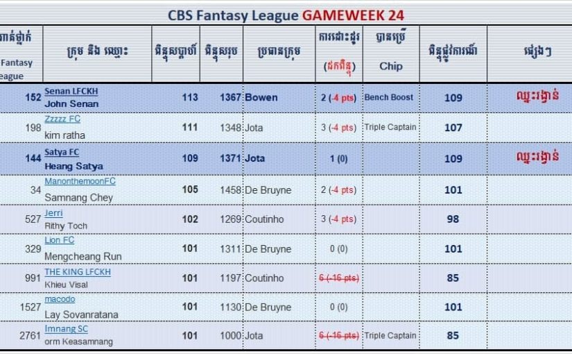 ជួបអ្នកឈ្នះទាំងពីររូបពីកម្មវិធី CBS Fantasy League សប្ដាហ៍ទី២៤ នៅថ្ងៃសុក្រសប្ដាហ៍នេះ