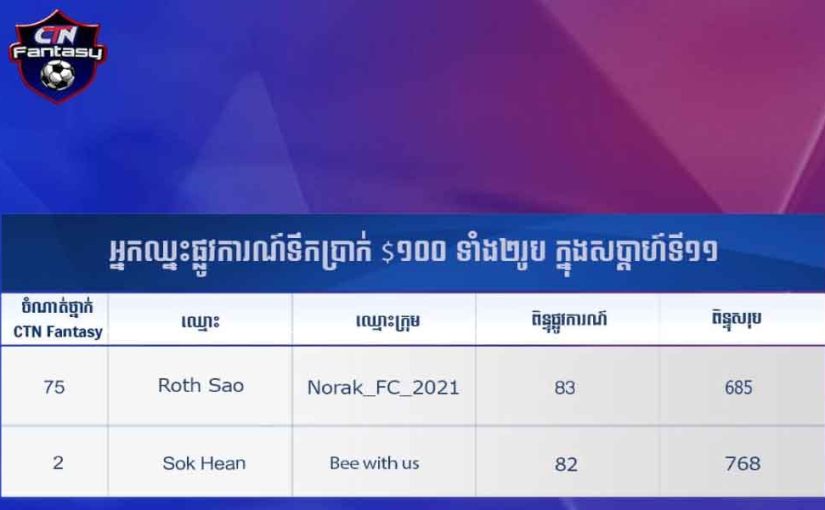 CBS Fantasy League៖ អបអរសាទរអ្នកឈ្នះ ១០០ដុល្លារពីររង្វាន់ កាលពីសប្ដាហ៍ទី១១