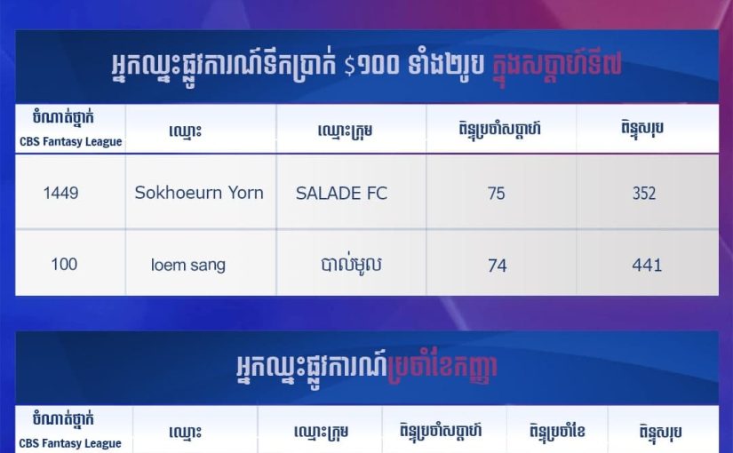 CBS Fantasy League៖ អបអរសាទរអ្នកឈ្នះទាំង២រូប កាលពីសប្ដាហ៍ទី៧ និងអ្នកឈ្នះប្រចាំខែកញ្ញា